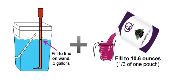 Using the CQ Slicer Key/Wand to measure the water level, fill the CQ Mixing Bucket with 3 gallons of cold, filtered water. Add 1/3 pouch of CQ Puree and stir.