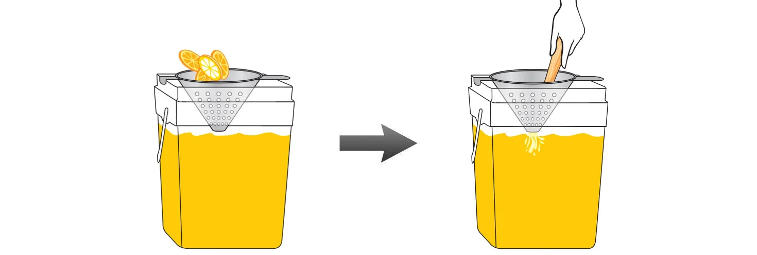 Next, place a metal strainer in the mixing bucket and muddle any remaining slices. This technique will ensure that no pieces end up blocking the spigot later.
